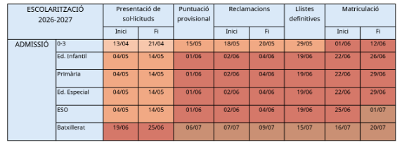 De dia 4 al 14 de maig es poden fer els tràmits i entregar la documentació (si precisa) al centre que escolliu com a primera opció. Podeu obtenir tota la informació de la Conselleria al següent enllaç.